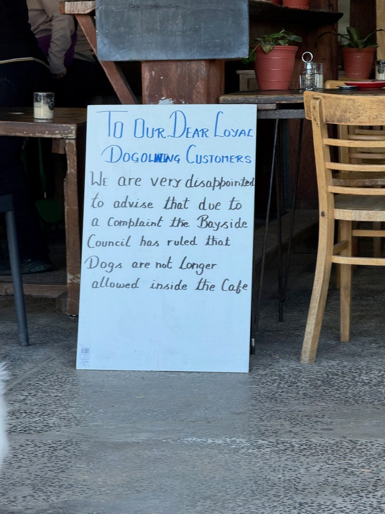 I read the sign again this morning and I realised just how very good it is, how very well written. There is not an unnecessary word. There is no unnecessary apology. There is no claiming that it’s not the fault of the café owners. They just tell the whole story in six lines.